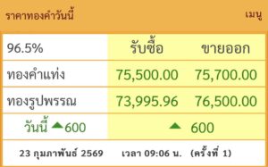 ราคาทองคำวันนี้ 23 กุมภาพันธ์ 2569 โดย สมาคมค้าทองคำ ประกาศราคาทองครั้งที่ 1 (เปิดตลาด) เมื่อเวลา 09.06 น. ปรับขึ้นพรวด 600 บาท สู่บริเวณ 75,700 บาท